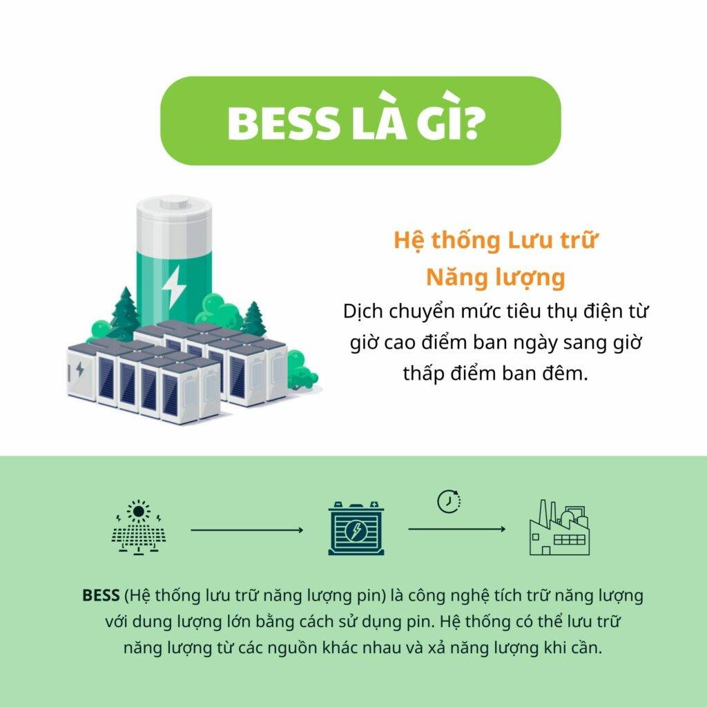 BESS là viết tắt của Battery Energy Storage Systems (“ Hệ thống lưu trữ năng lượng pin”) là công nghệ tích trữ năng lượng với dung lượng lớn, bằng cách dùng pin như ion lithium, loại pin sạc có thể lưu trữ năng lượng từ các nguồn khác nhau và xả năng lượng khi cần. Hệ thống BESS bao gồm một hoặc nhiều pin và có thể được sử dụng để cân bằng lưới điện, cung cấp năng lượng dự phòng và cải thiện độ ổn định của lưới điện.